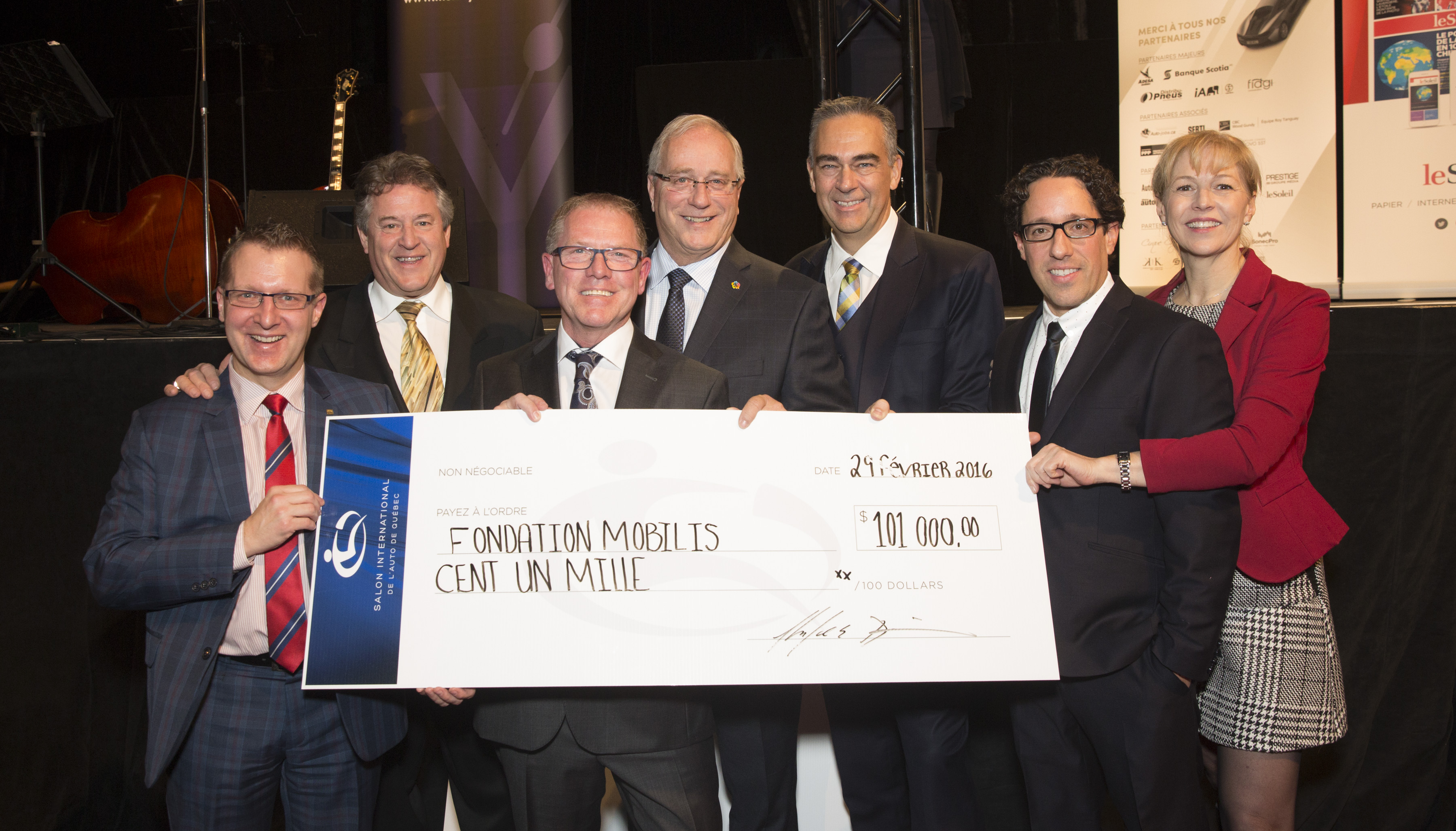 Don de 101 000 de la Fondation Mobilis : Martin Roy, conseiller en placement chez CIBC Wood Gundy, Luc Paradis, associé chez Morency Avocats, Claude Plamondon, président du Salon, Yves Watier, directeur principal à La Capitale, Mario Bédard, président du CA chez Mallette, Charles Drouin, directeur général du Salon, et Nathalie Langevin, directrice générale de TVA Québec.