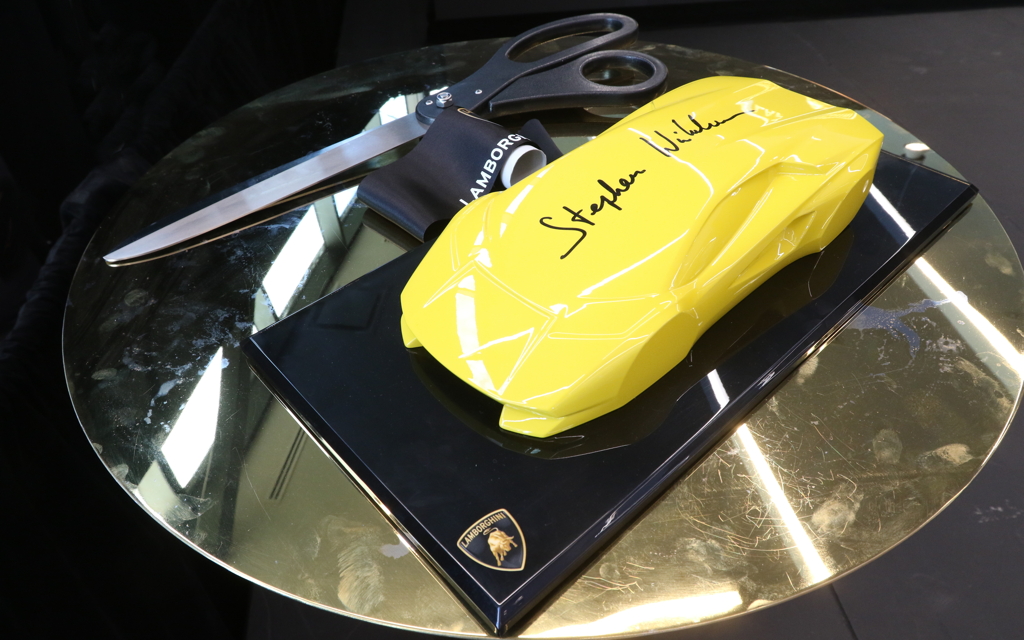 Andrea Baldi, chef de la direction d’Automobili Lamborghini America LLC, la filiale nord-américaine de la marque, était également à ses côtés. Pour souligner l’importance de l’événement, il lui a d’ailleurs remis une sculpture portant la signature de Stephan Winkelmann, grand patron de la marque.