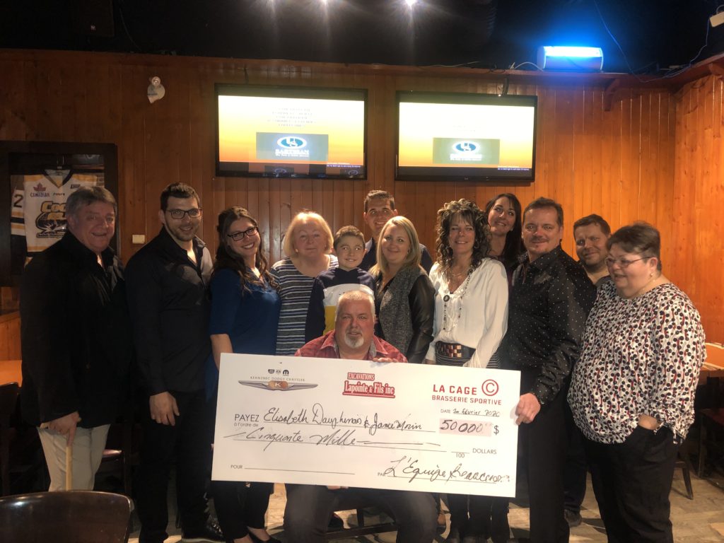 Le 1er février dernier, la concession Kennebec Dodge Chrysler, en partenariat avec Excavations Lapointe & Fils et Style Musique, ont organisé une soirée-bénéfice à La Cage Brasserie Sportive de Saint-George-de-Beauce. Cette activité a permis de recueillir 50 000 $ pour deux enfants de la région.