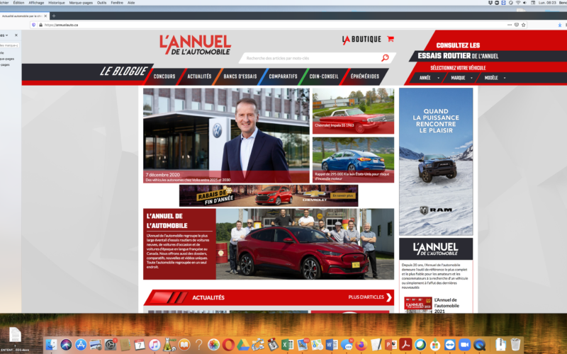 L’année 2020 c’est aussi l’année des 20 ans de l’Annuel de l’Automobile et je tenais à souligner la chose, malgré l’atmosphère qui n’est pas è la joie. En allant sur le site annuelauto.ca, vous pouvez cliquer sur l’onglet concours et participer à ce concours. Vous courez la chance de remporter une des deux séries complètes des Annuel de l’automobile (22 livres en tout en incluant les éditions 2012,5 et 2013,5) en plus de 5 livres 2021. Vous avez jusqu’au 19 décembre pour vous inscrire. Nous ferons le tirage le 21 décembre. Profitez-en pour vous inscrire à notre infolettre pour être au parfum de tout ce qui bouge en automobile, c’est tout à fait gratuit
