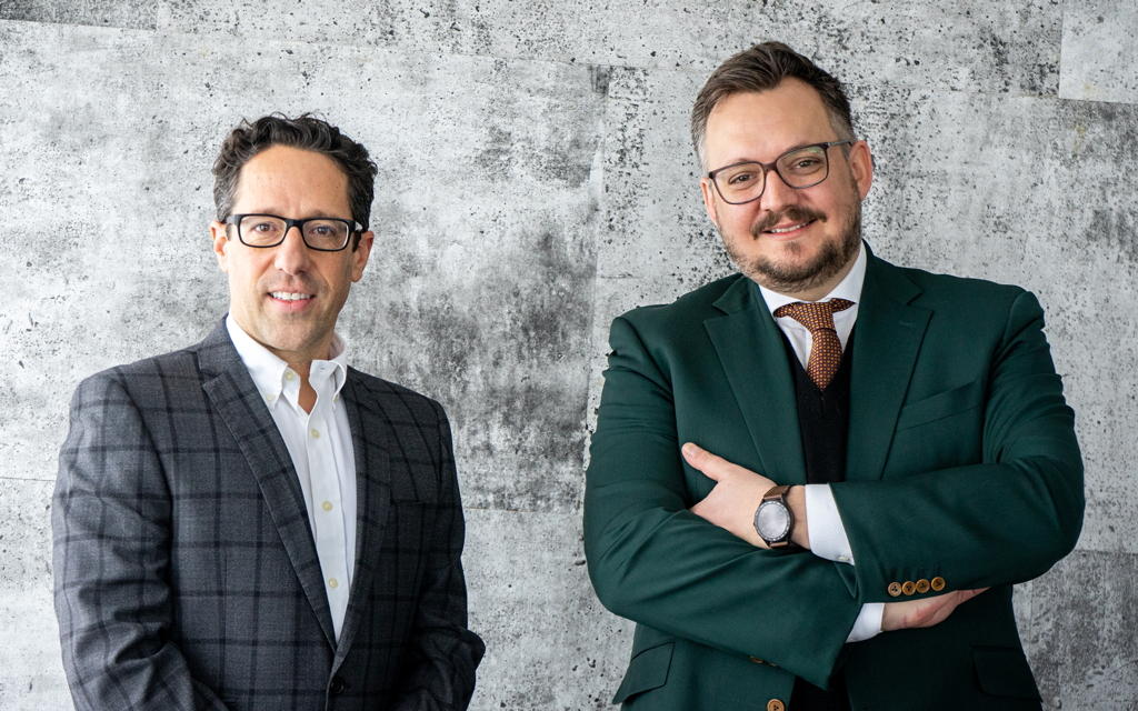 Sur la photo du haut, on voit Louis Desmeules (d.), le président de la Corporation Mobilis et directeur général de Porsche Québec, et Charles Drouin, le chef de la direction de la Corporation Mobilis.